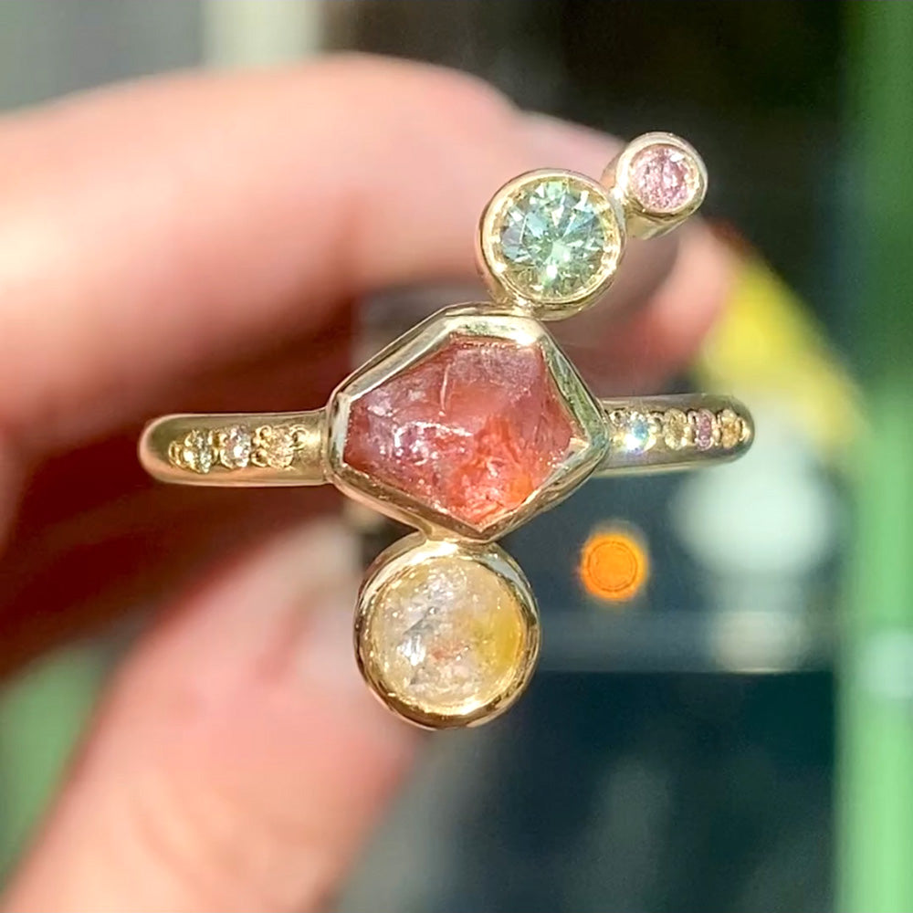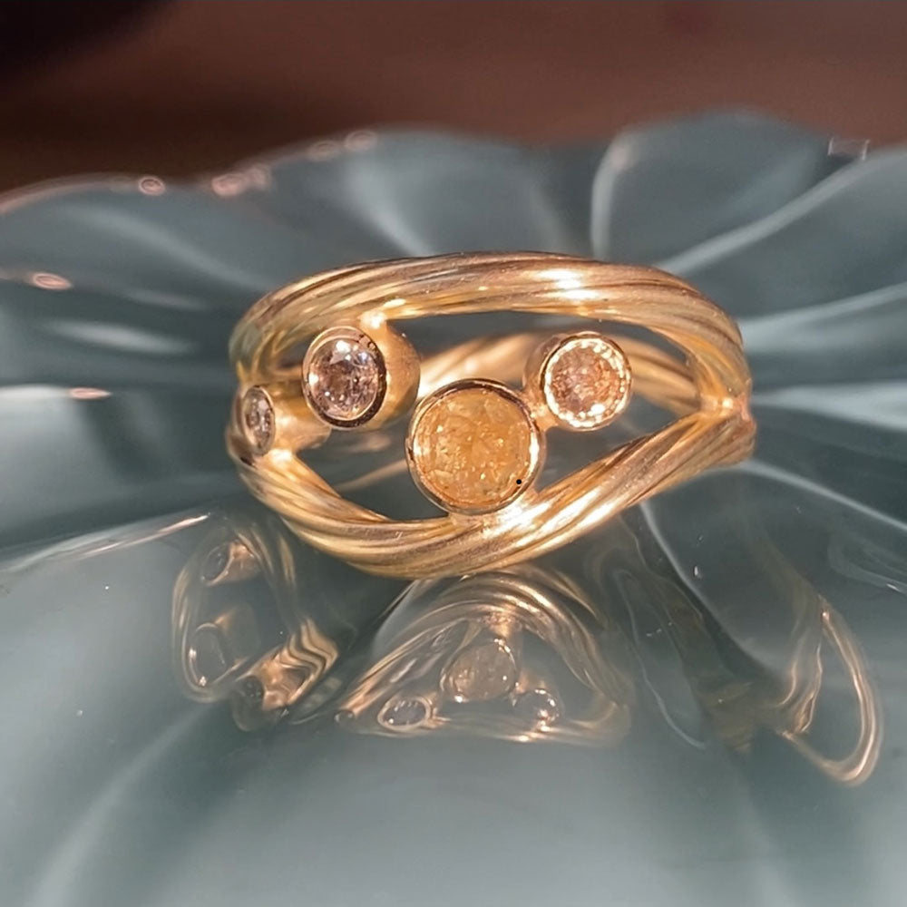 Min tilgang til guldsmede håndværket er farverig, intuitiv og legende. Jeg har ikke let ved at drysse om mig med ord, der beskriver den kreative proces, når stene, guld og perler danner alliancer i mine hænder og bliver til personlige smykker til både mænd og kvinder. Mine værker er genkendelige, de ligner ikke andres, og det er den primære grund til at folk finder vej til ’Kleines’, som min butik hedder.